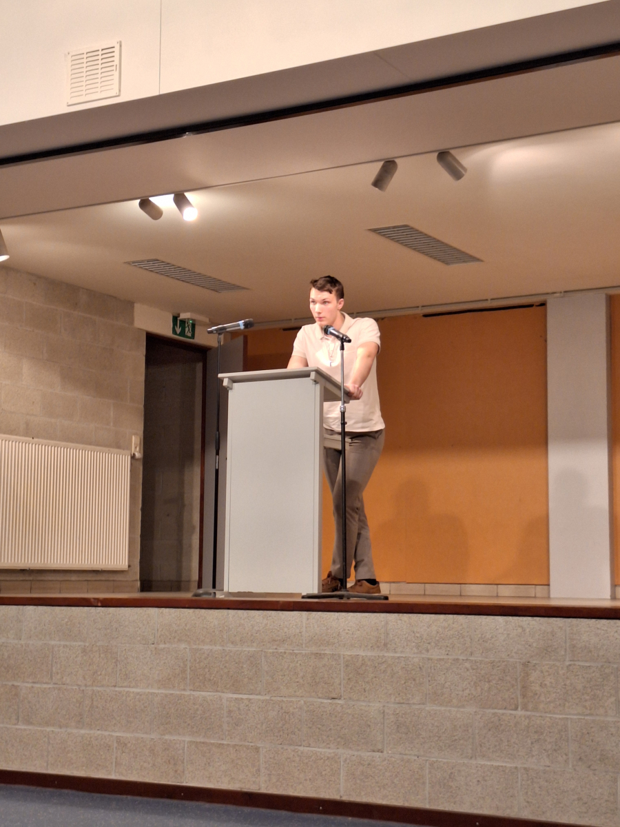 Ce jeudi soir, quatorze de nos élèves ont décidé… de nous épater. Et ils ont réussi! Nicolas, Antoine, Nour, Margaux, Cheïma, Sofyane, Noah, Inès, Alexis, Cléa, Matteo, Lola, Léo, Clémentine, poussé.es par une motivation personnelle (une promesse faite à papa, l’attrait des pizzas gratuites, l’envie de se challenger ou de défendre une cause,…), ont surmonté le trac et le stress pour monter sur scène et nous montrer un petit bout de qui ils.elles sont vraiment. Aucun.e n’a démérité, aucun.e n’a flanché, aucun.e n’a faibli, mais tou.te.s ont brillé et ont fait preuve d’éloquence, mais aussi de coeur et d’engagement. Un très beau moment, partagé avec un public nombreux et chaleureux, à l’image de l’amitié qui semble lier particulièrement fort nos élèves de rhéto cette année.